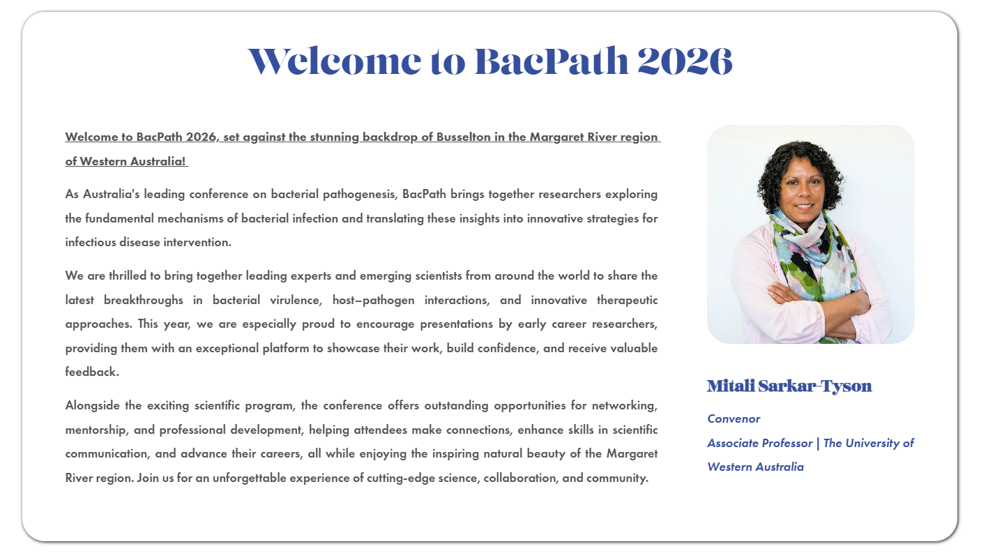 As Australia's leading conference on bacterial pathogenesis, BacPath brings together researchers exploring the fundamental mechanisms of bacterial infection and translating these insights into innovative strategies for infectious disease intervention.